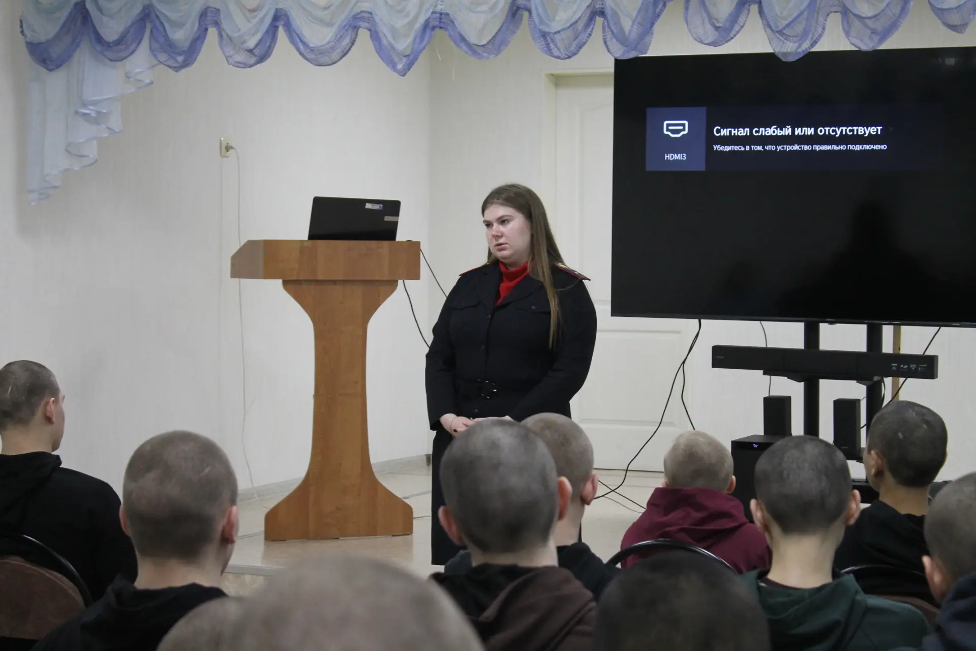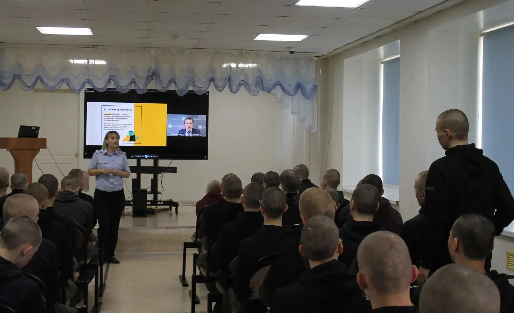 Подполковник полиции подробно рассказала юношам, как их ровесники, желая подзаработать, становятся дропперами и предупредила, что за эти деяния предусмотрена уголовная ответственность. Для наглядности спикер продемонстрировала аудитории видеоролик «Кто такие дроперы».