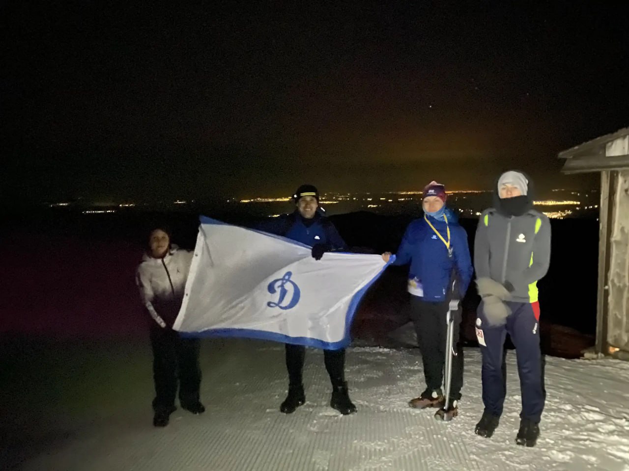 Семья Алексея Смокотнина добралась до финиша вместе, развернув флаг «Динамо».