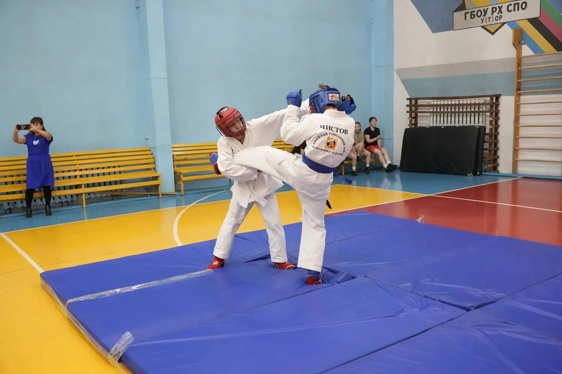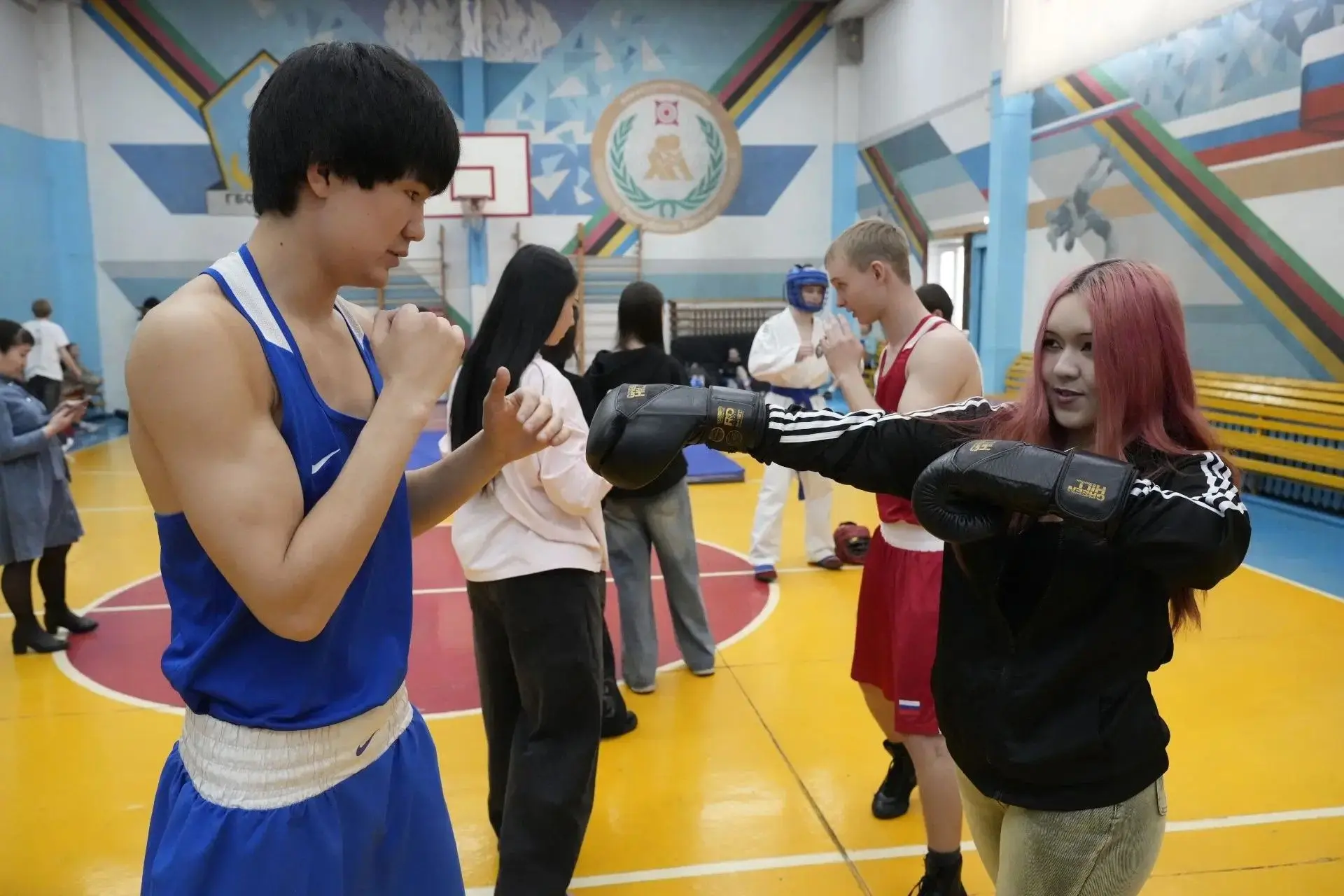 В это же время работа на всех площадках велась синхронно – в спортзале техникума парни и девушки из У(Т)ОРа демонстрировали гостям приёмы самозащиты из арсеналов борьбы, бокса и рукопашного боя. Желающие научиться самообороне, среди которых было немало девушек, становились в очередь.