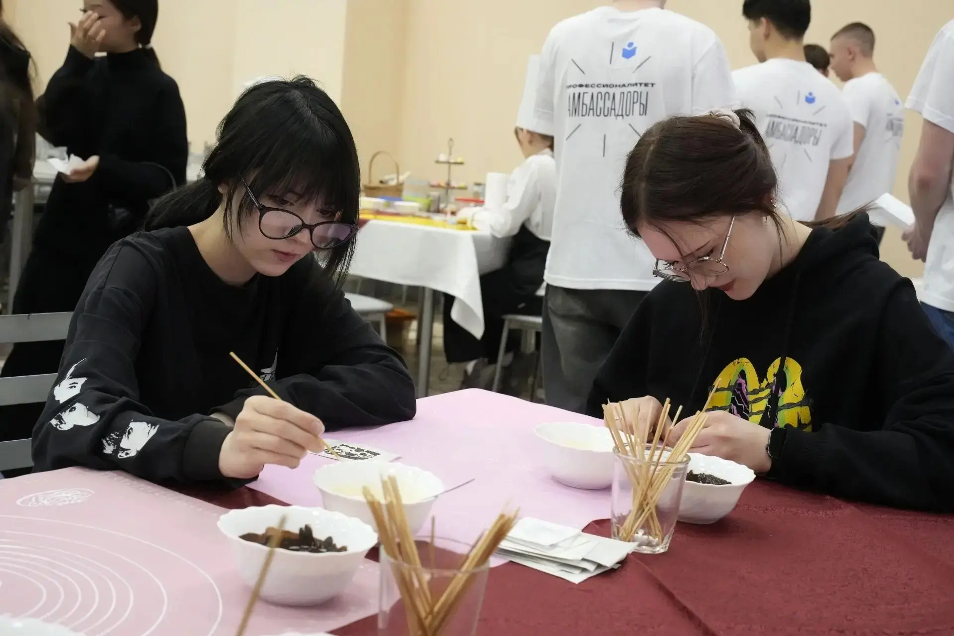 Знакомство с будущей профессии началось не с лекций, а с работы руками - на площадках, где проводились профессиональные пробы. Будущие абитуриенты учились изготовлять шоколадные картины, мини-тортики "трайфлы", десерты из талгана. Всё это с обязательной дегустацией!