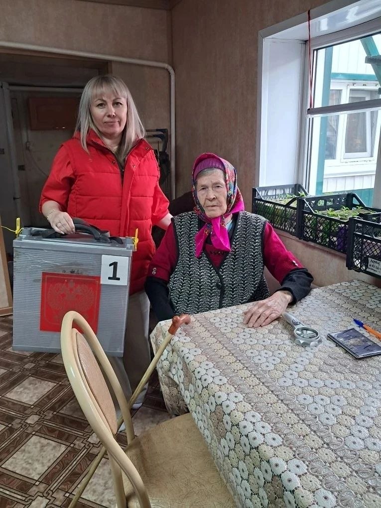 Некоторые воспользовались возможностью проголосовать дома. На фотографии Галина Александровна Латышенко, старейшая жительница п. Тепличный. Ей 94 года, много лет работала в медицине. Прекрасный пример гражданской ответственности!