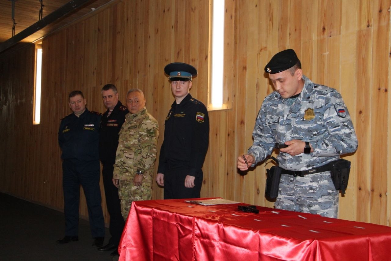 Руководители силовых структур поздравили бойцов и лично продемонстрировали навыки обращения с новым оружием в тире.