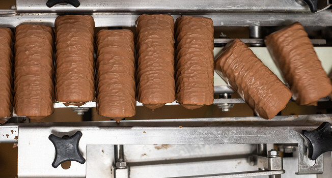 - В финальной стадии творожные бруски покрываются бельгийским шоколадом Barry Callebaut.
