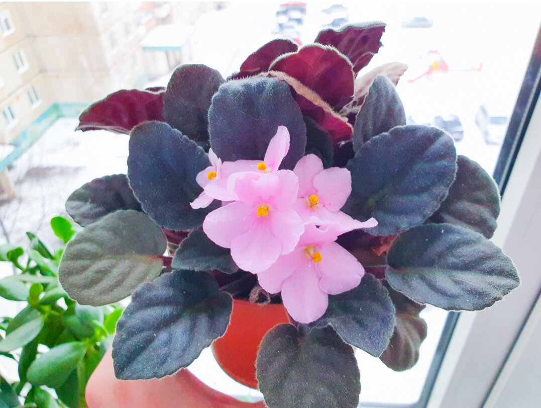 В арсенале мамы несколько фиалок, одна из которых была спасена мной после неудачного ухода. Напоминаю, что она укоренила её, просто отщипнув верхушку, и теперь эта фиалка цветёт без пересадки из транспортировочного грунта на протяжении многих лет. В отличие от рекомендаций, мама держит фиалки в 10-сантиметровых горшках и не разделяет их – в одном горшке могут размещаться несколько растений. Тем не менее, цветение происходит регулярно, и они радуют своим внешним видом.