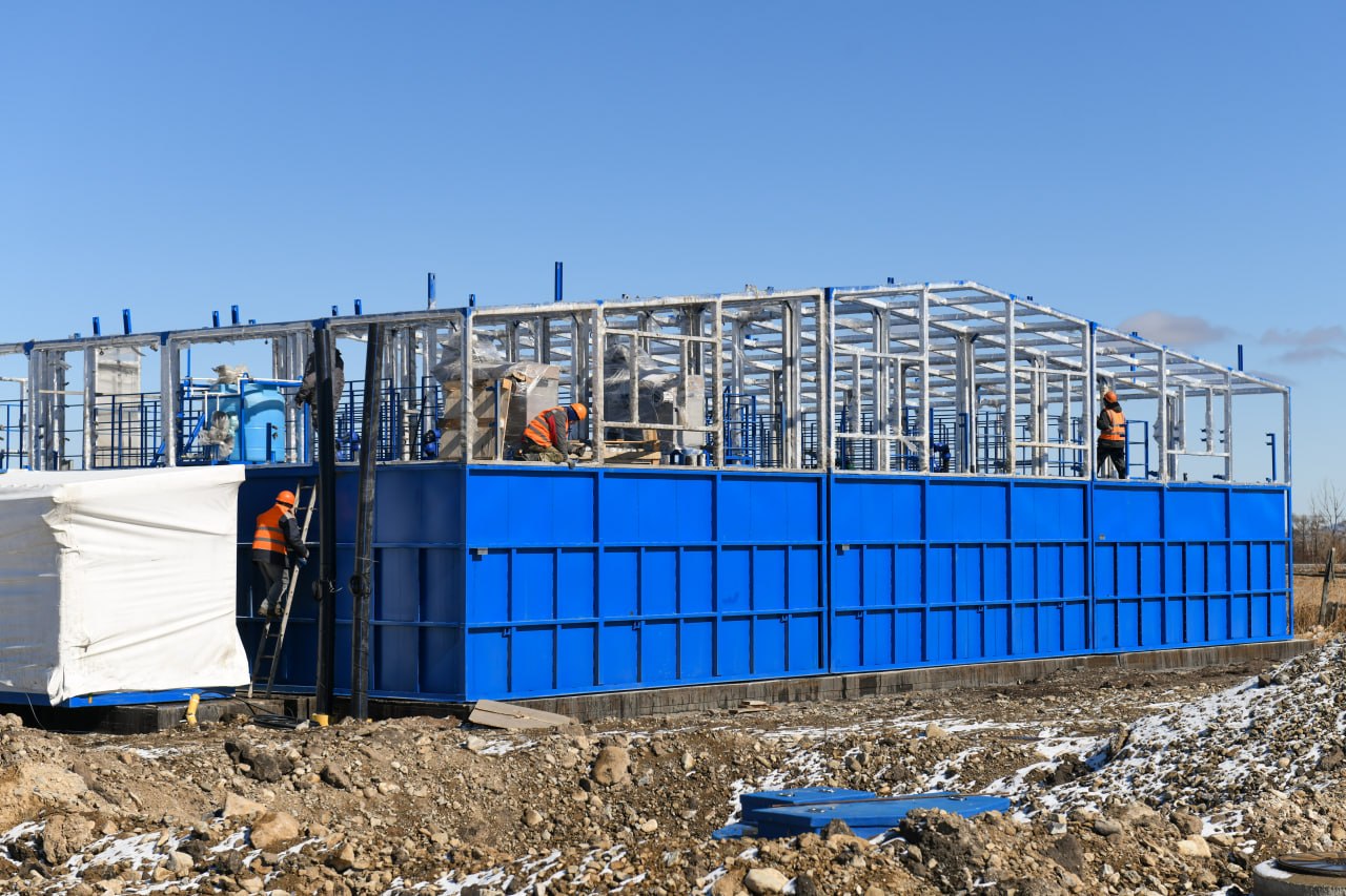 На очистных готовность — 84%, стоимость — почти полмиллиарда рублей. Оборудование поставлено, траншея засыпана, трубы уложены и утеплены. Благоустройство территории запланировано на май.