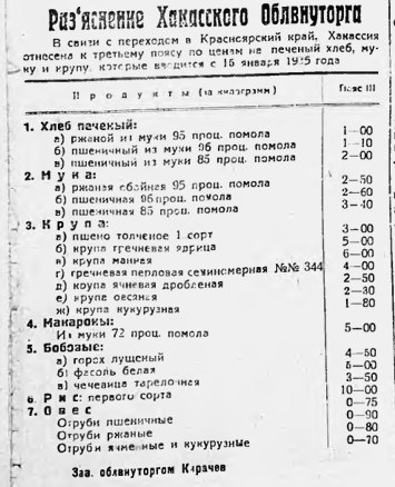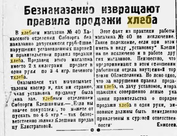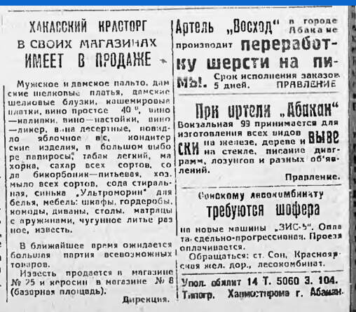 Некоторые городские предприятия в 30-40 годах действовали как хозяйственныхе магазины. Например, в газете «Советская Хакассия» 14 января 1937 года читаем: «Абаканский мясокомбинат имеет в продаже в неограниченном количестве фабрикаты собственного производства: мыло хозяйственное 50 проц., клей столярный, гребешки роговые разных размеров, мазь колесную. За всеми справками обращаться в отдел сбыта мясокомбината». «Хакасский красторг» публиковал объявления о том, что и где можно приобрести, причём в одном месте продавали пальто, шёлковые платья, синьку, матрасы с пружинами, чугунное литьё, известь…