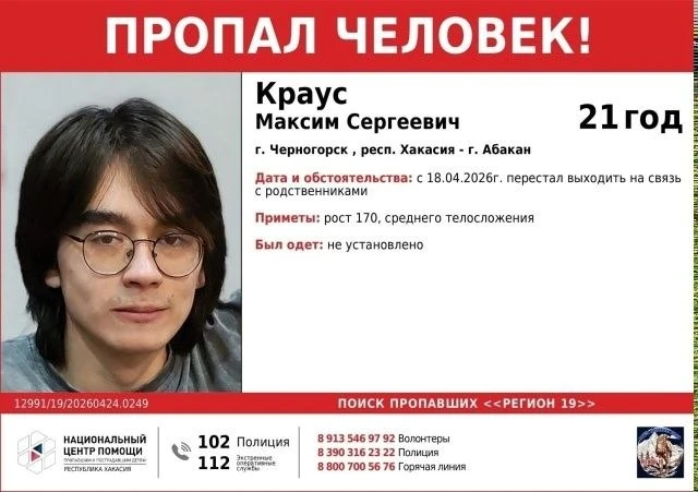 Молодой человек проживает в Черногорске. 18 апреля он перестал выходить на связь с родственниками.